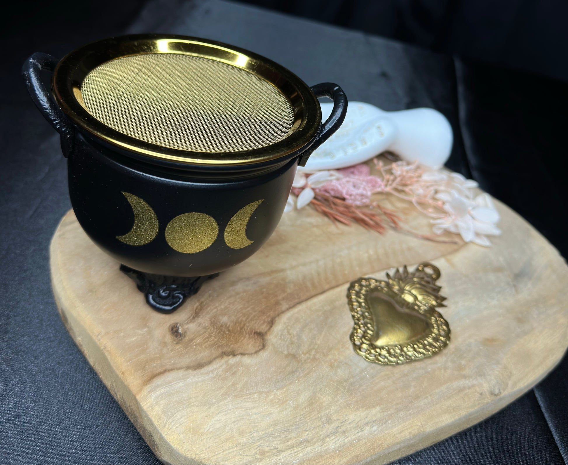 Ce chaudron noir aux phases lunaires dorées, accompagné de son tamis doré, est l’outil parfait pour tous tes rituels, fumigations et pratiques magiques.